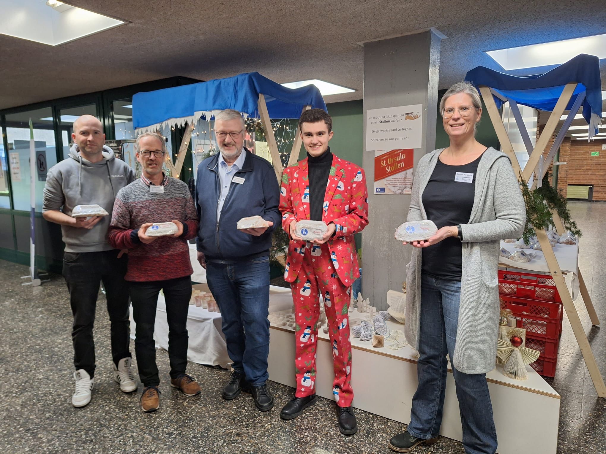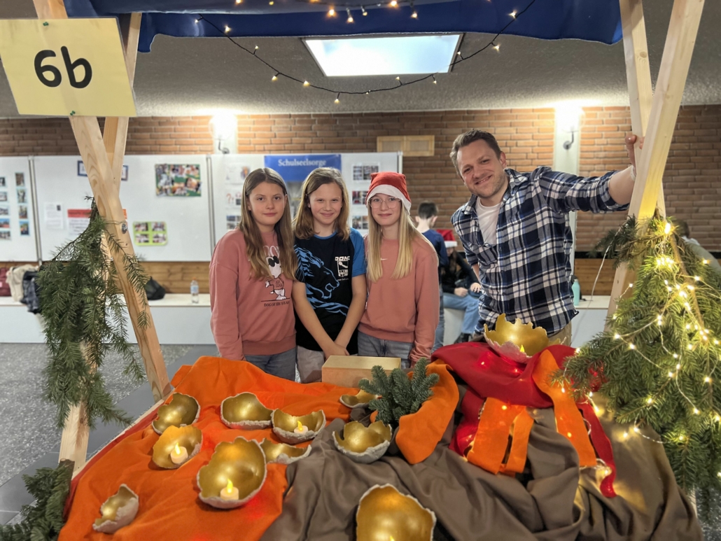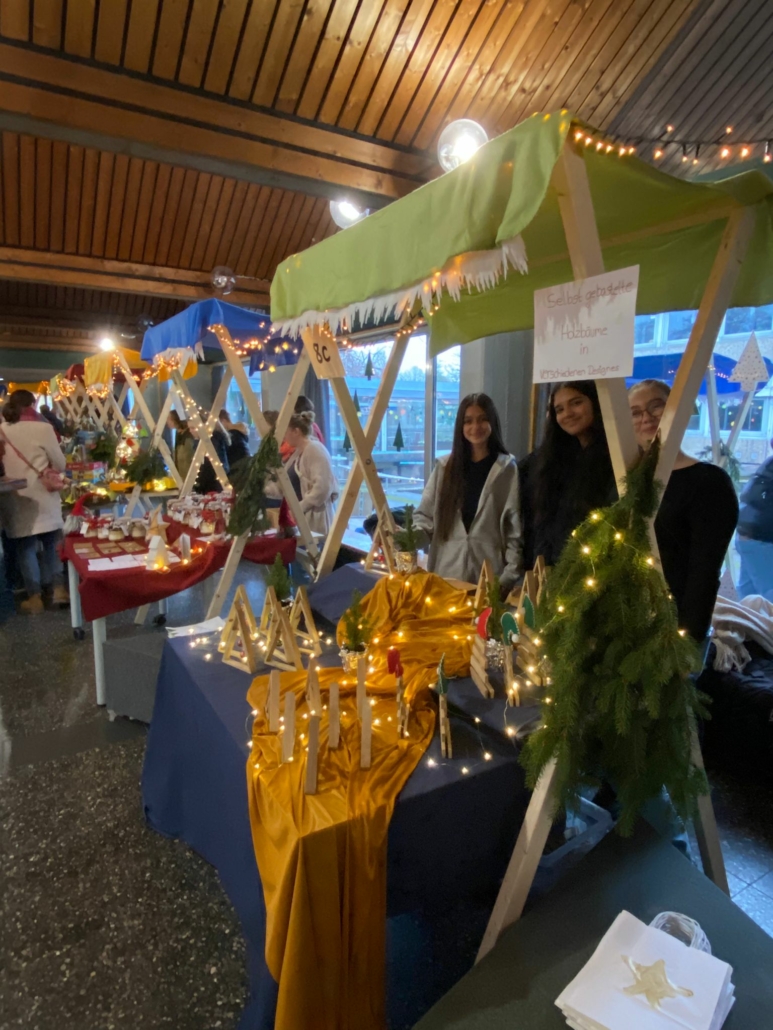 „Es ist fantastisch, dass wir unseren großen Nikolausmarkt in so festlicher Atmosphäre mit der gesamten Schulgemeinschaft und so vielen Interessierten erleben konnten! Toll, dass sich alle Klassen so engagiert haben und dadurch etwas Besonderes entstehen konnte!“: Durchweg positiv schaut Schulleiterin Miriam Baumeister auf den Nikolausmarkt der Realschule St. Ursula zurück, der am 8.12. stattfand. An eigens für dieses Ereignis von Schülerinnen und Schülern der Werk-AG hergestellten, adventlich geschmückten Ständen verkauften die Klassen liebevoll Selbstgebasteltes und andere Geschenkartikel, die in den vergangenen Wochen und Monaten entstanden waren. Glücklich und stolz präsentieren die Schülerinnen und Schüler „ihre“ Werke und freuten sich über das große Interesse der Besucherinnen und Besucher. Das vielfältige Angebot lieferte wohl so Manchem die zündende Geschenkidee für das bevorstehende Weihnachtsfest. Als weiteres Highlight fand eine Verlosung von XL-Nikoläusen statt.