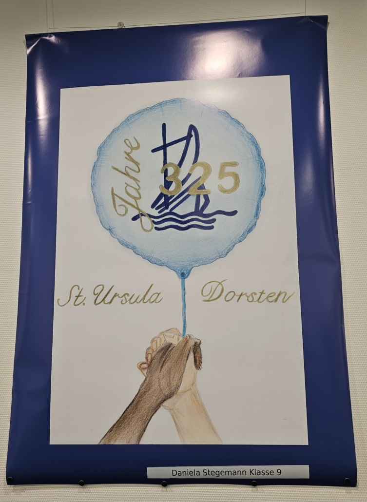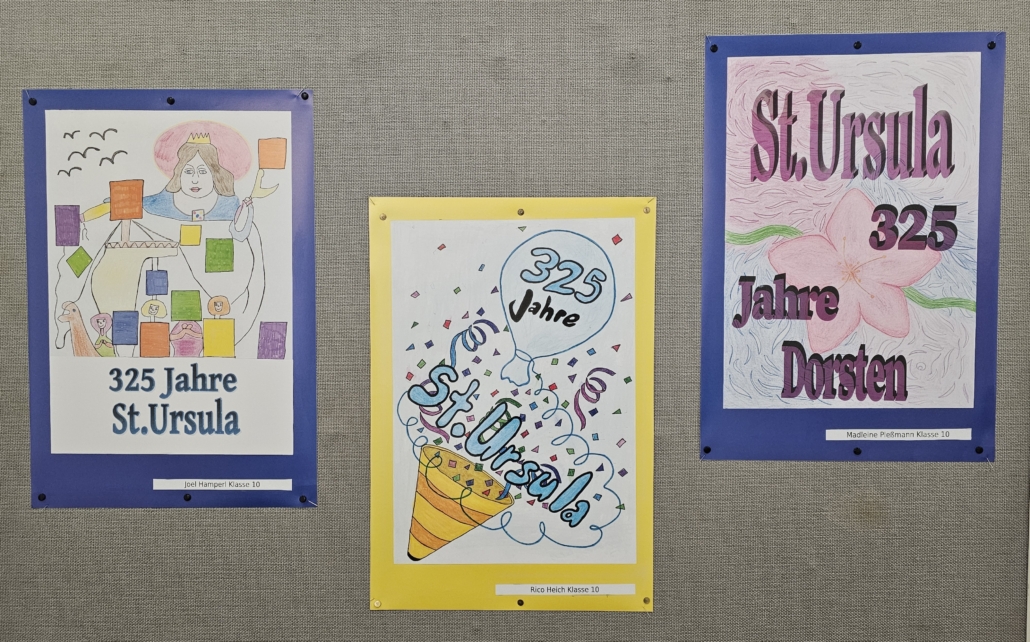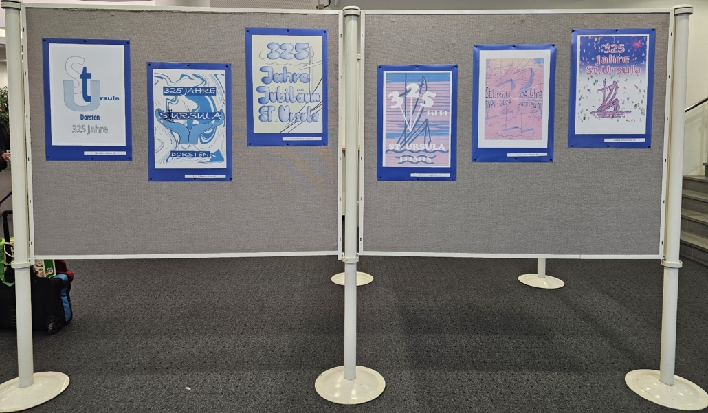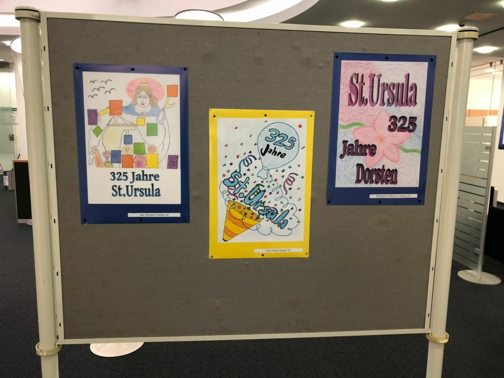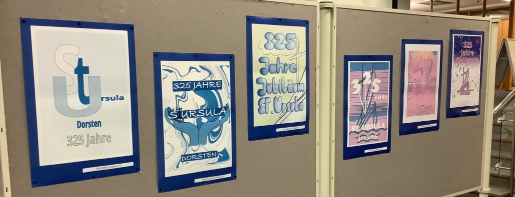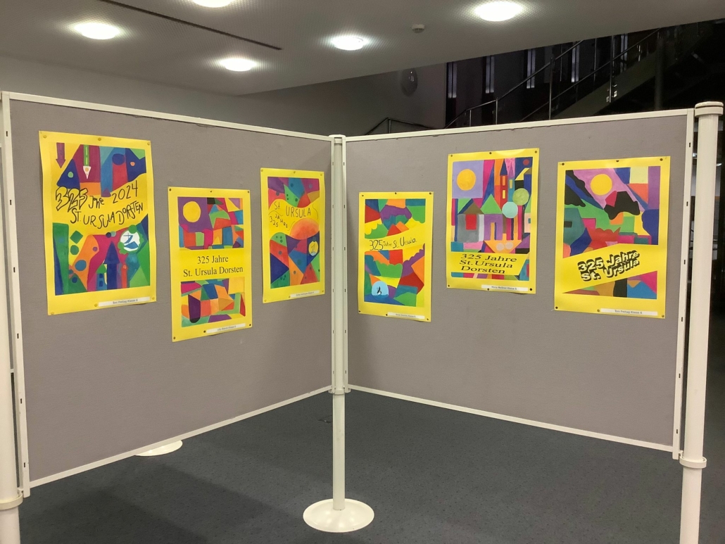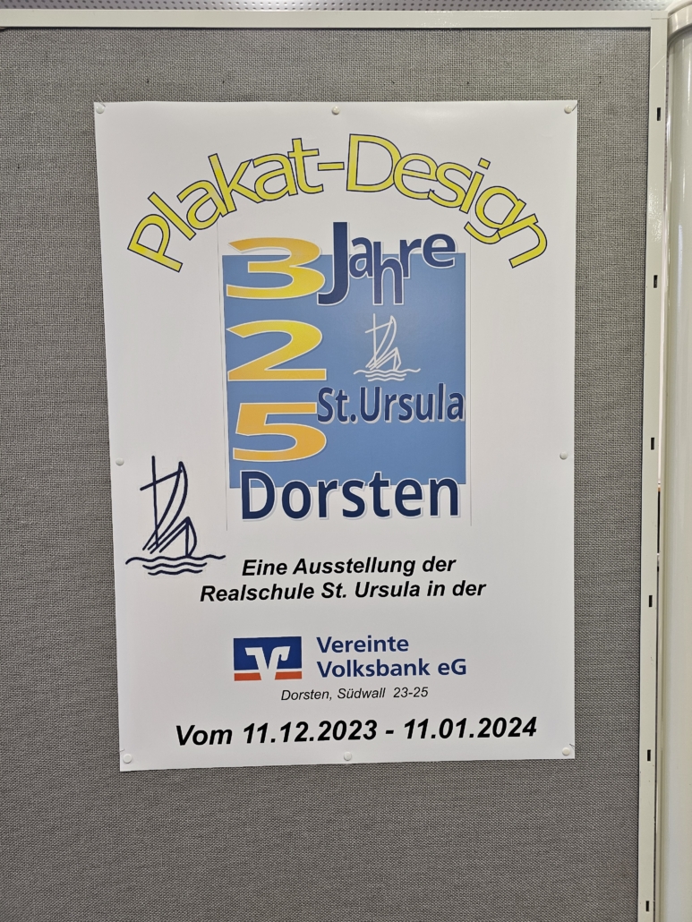 So setzten sich an der Realschule St. Ursula auch verschiedene Lerngruppen unterschiedlicher Altersstufen im Rahmen des Kunstunterrichts mit diesem bedeutenden Jubiläum auseinander. Die Schülerinnen und Schüler beschäftigten sich zunächst mit den Themen Werbung und Plakat-Design theoretisch, um dann mit verschiedenen künstlerischen Techniken (Wasserfarbenmalerei, Filzstiftzeichnung, PC-Grafik) ihre Plakatideen zum Schuljubiläum umzusetzen. So entstanden ganz unterschiedliche Werbeplakate mit dem Schwerpunkt „325 Jahre St. Ursula in Dorsten“. Dank der großartigen Unterstützung der Volksbank Dorsten, die den Schülerinnen und Schülern erneut eine Plattform geboten hat, um Kunst aus dem Schulgebäude nach außen zu tragen und so einer breiten Öffentlichkeit näher zu bringen, ist es nun möglich, die Werke zu den üblichen Geschäftszeiten in der Hauptstelle am Südwall zu besichtigen.