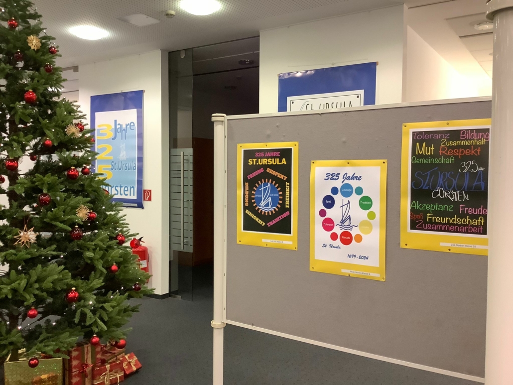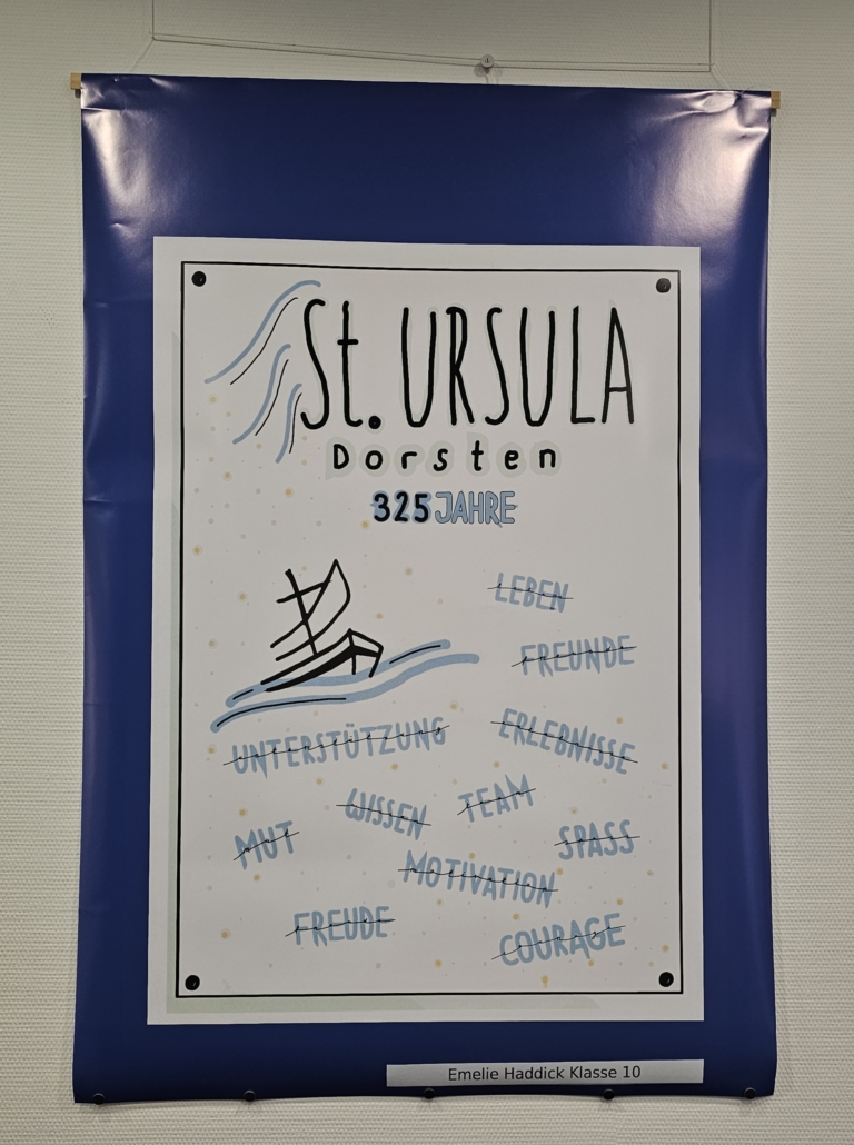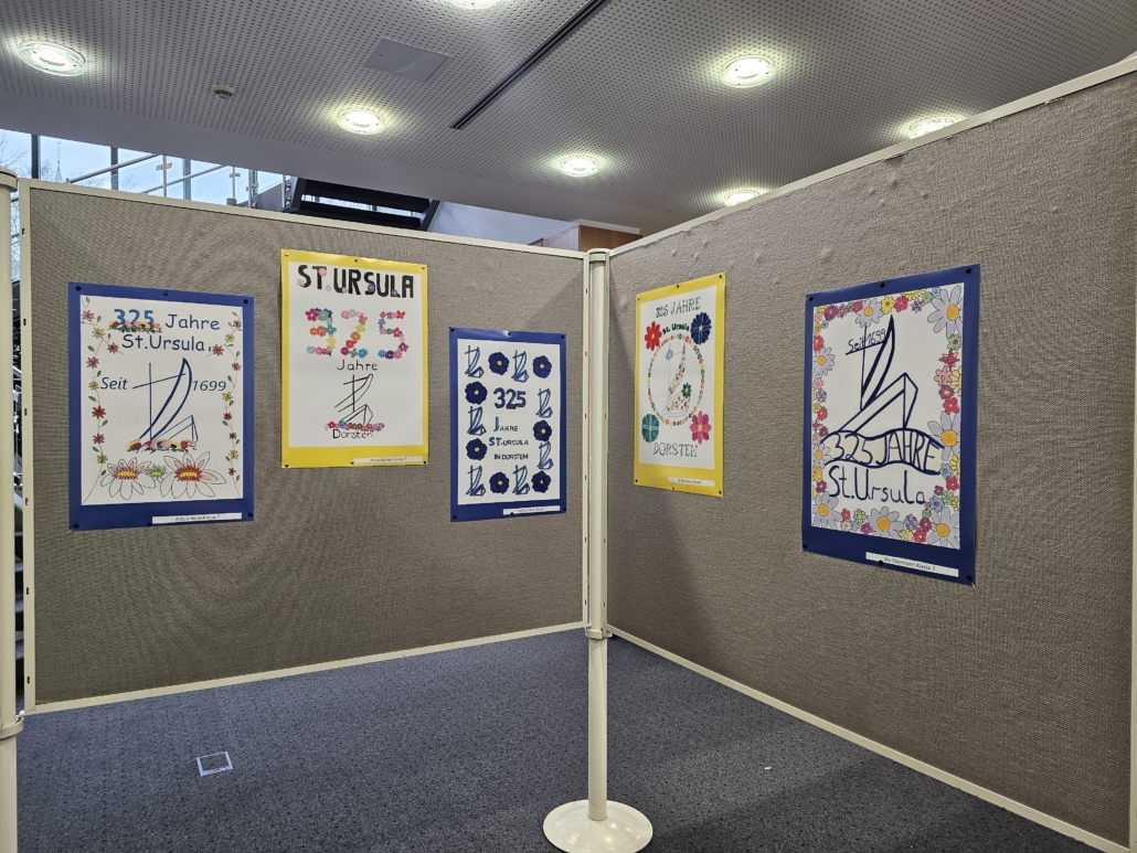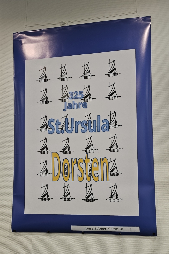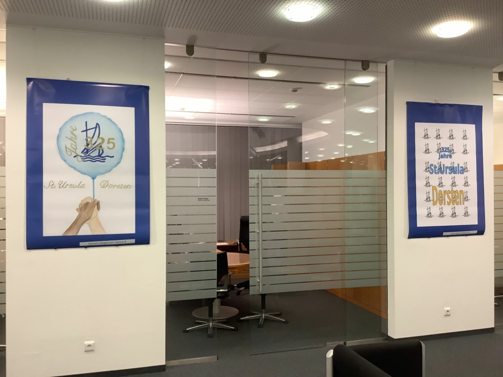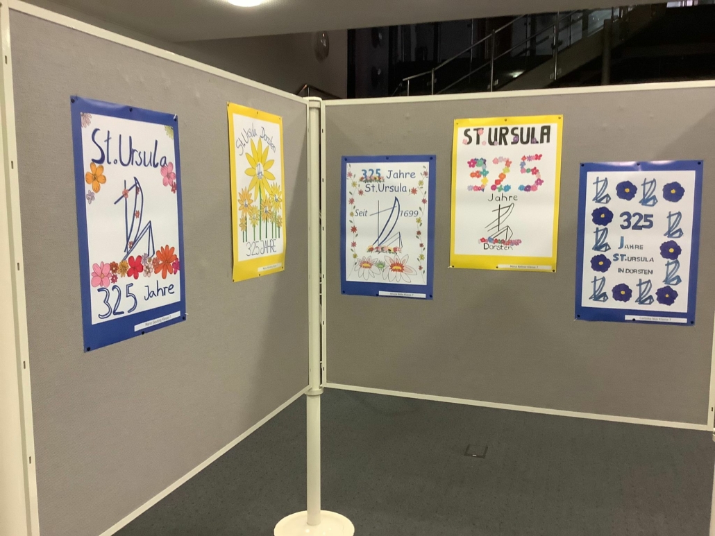 So setzten sich an der Realschule St. Ursula auch verschiedene Lerngruppen unterschiedlicher Altersstufen im Rahmen des Kunstunterrichts mit diesem bedeutenden Jubiläum auseinander. Die Schülerinnen und Schüler beschäftigten sich zunächst mit den Themen Werbung und Plakat-Design theoretisch, um dann mit verschiedenen künstlerischen Techniken (Wasserfarbenmalerei, Filzstiftzeichnung, PC-Grafik) ihre Plakatideen zum Schuljubiläum umzusetzen. So entstanden ganz unterschiedliche Werbeplakate mit dem Schwerpunkt „325 Jahre St. Ursula in Dorsten“. Dank der großartigen Unterstützung der Volksbank Dorsten, die den Schülerinnen und Schülern erneut eine Plattform geboten hat, um Kunst aus dem Schulgebäude nach außen zu tragen und so einer breiten Öffentlichkeit näher zu bringen, ist es nun möglich, die Werke zu den üblichen Geschäftszeiten in der Hauptstelle am Südwall zu besichtigen.