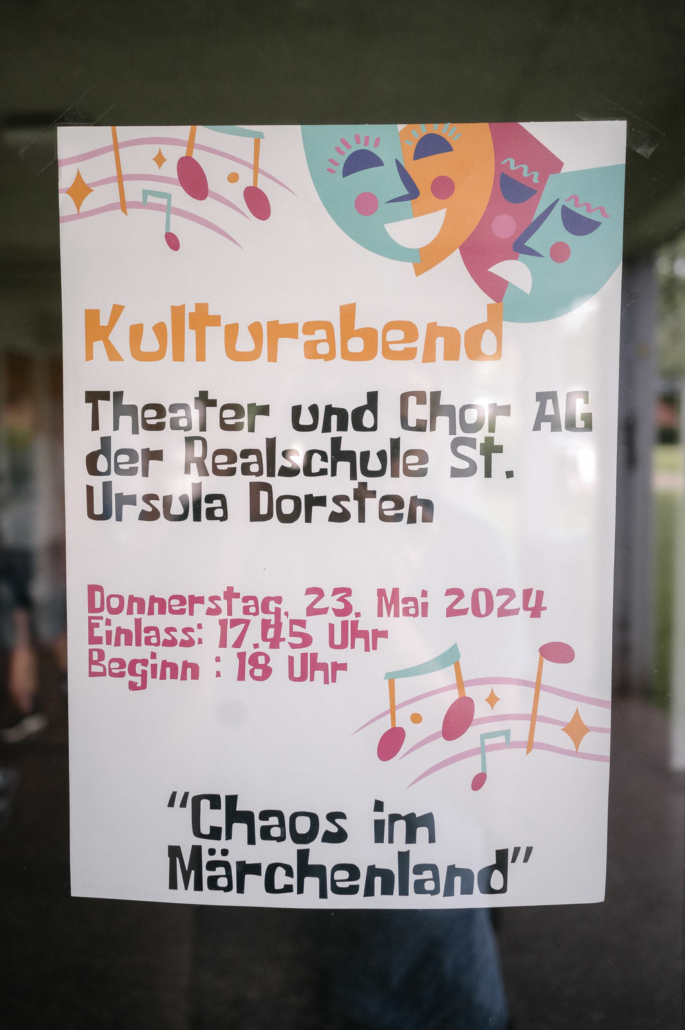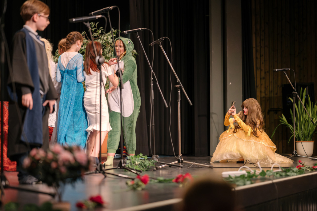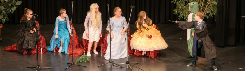Zu einem bunten Kulturabend luden nun die Theater- und Chor-AGs unserer fünften und sechsten Klassen unter der Leitung von Carina Nielbock, Melina Neuhaus und Jörg Overgoor ein. Der Chor, unterstütz von Jan Dowe, begrüßte das Publikum mit einer bunten Mischung aktueller Popsongs, die für blendende Laune in der gut besuchten Aula sorgten. Im Anschluss brachten die Mädchen und Jungen der Theater-AG das Stück „Chaos im Märchenland“ auf die Bühne: Die goldene Kugel von Prinzessin Griselda ist weg und prompt steht die Märchenwelt Kopf: Sowohl der Froschkönig als auch die Prinzessin begeben sich auf eine abenteuerliche Suche nach der goldenen Kugel: Sie unternehmen mit ihren Gehilfen, dem Zauberlehrling und Tinkerbell, eine aufregende Reise quer durch den Märchendschungel – das begeisterte Publikum begleitete die Schauspielerinnen und Schauspieler gerne!