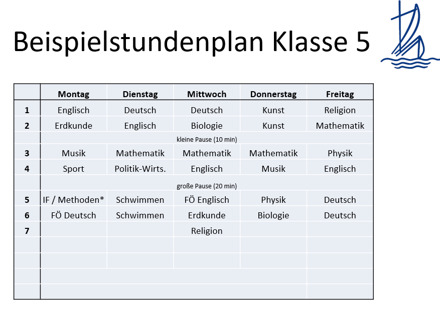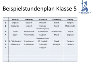 In der Regel haben die Fünftklässler an vier Tagen Unterricht bis 13:00 Uhr. An einem Tag (zwischen Montag und Donnerstag) steht zusätzlich die 7. Stunde bis 13:50 Uhr auf dem Plan. Einen typischen Stundenplan der Jahrgangsstufe 5 sehen Sie auf dem nebenstehenden Bild.