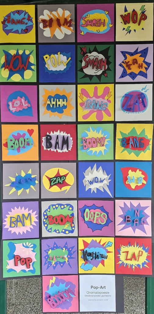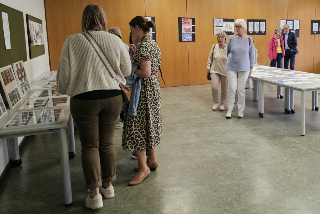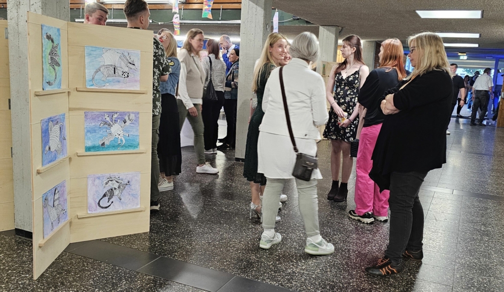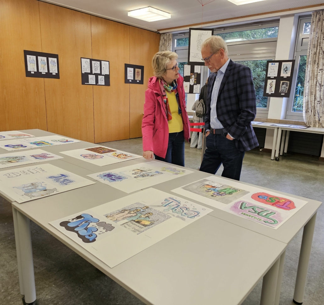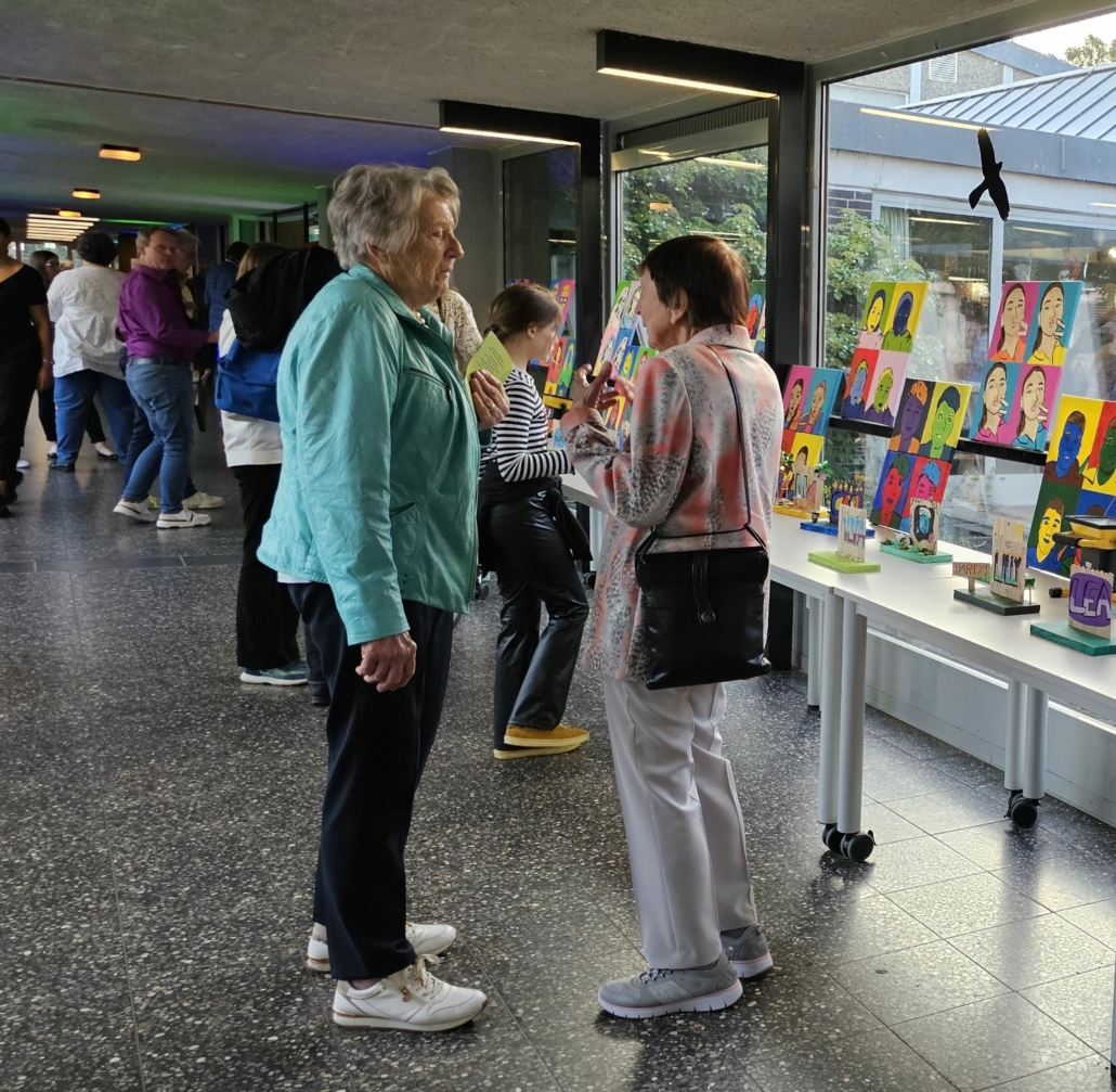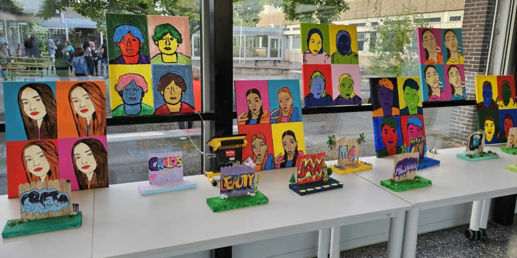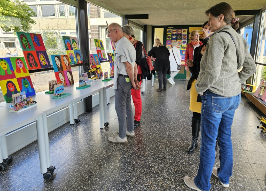 Zu Beginn durften sich die zahlreichen Gäste von einer beeindruckenden Vernissage ganz unterschiedlicher Schülerarbeiten faszinieren lassen, die in der Pausenhalle sowie im Musikraum ausgestellt waren. Ob Kunst nach Tisa von der Schulenburg, Graffiti, Popart-Kunst, Bleistiftzeichnungen, Comics oder Höhlenmalerei – die kreativen Werke der Kinder und Jugendlichen zeigten eindrucksvoll, wie vielfältig und facettenreich Kunst sein kann.