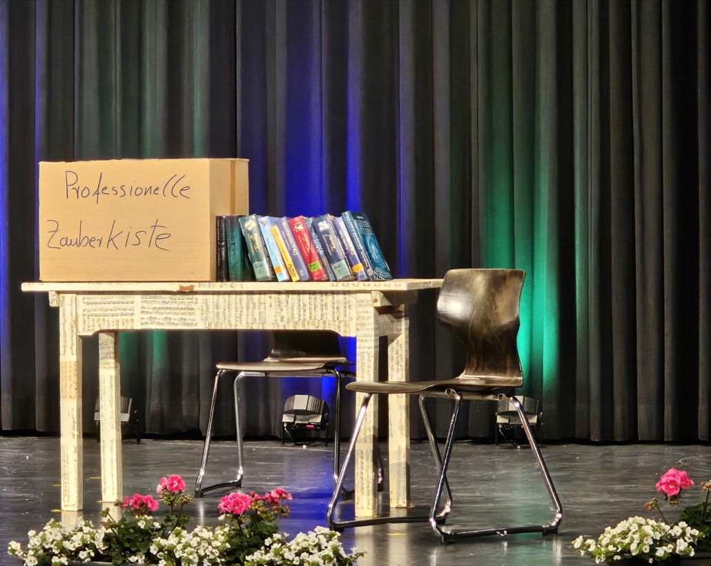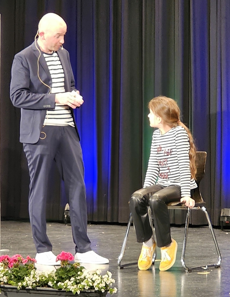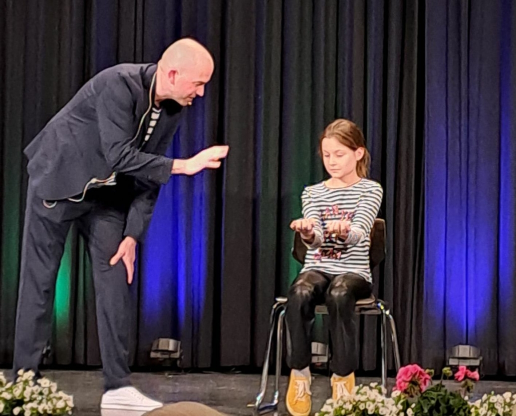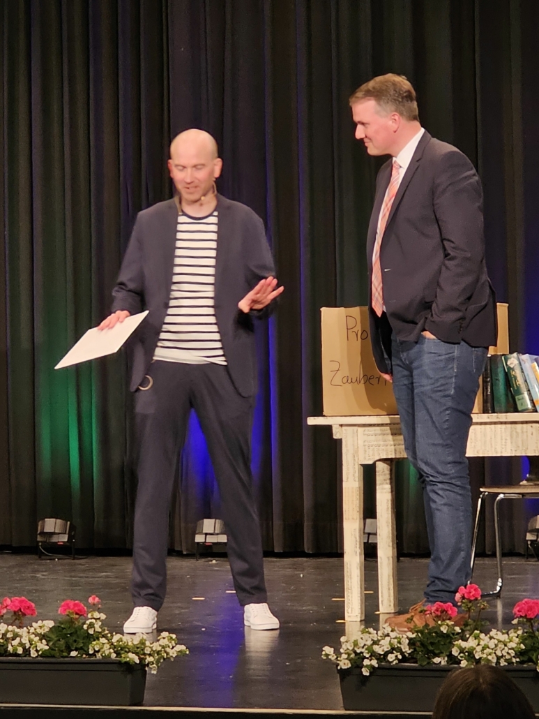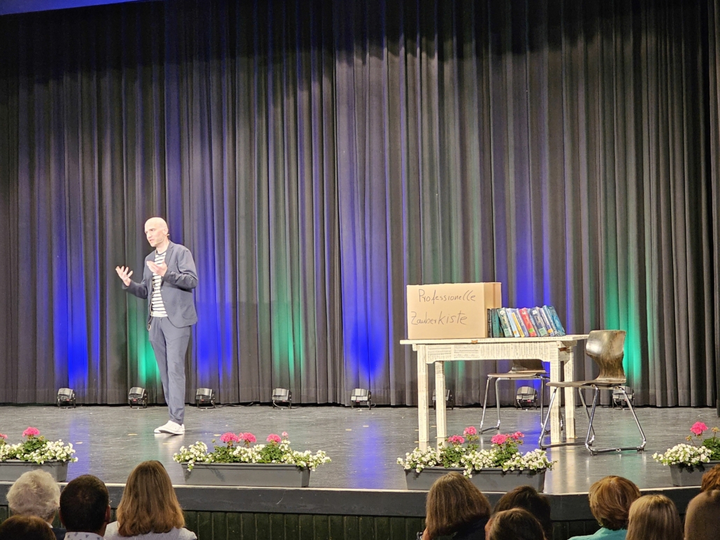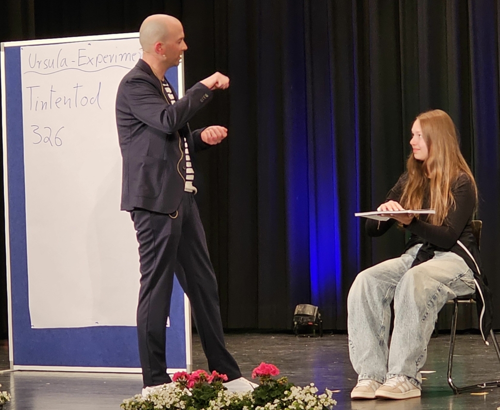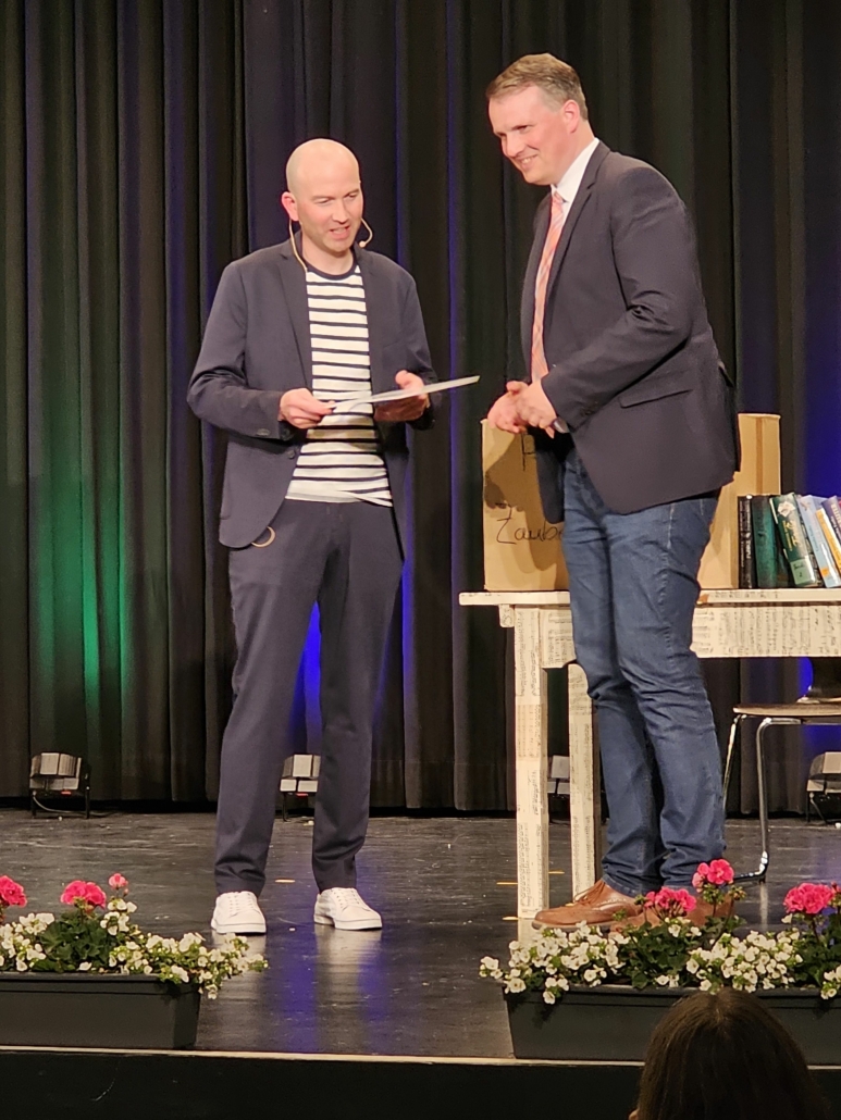 Lehrer Norman Riedel „verzauberte“ das Publikum mit einem Ausflug in die Welt der Illusion: Gemeinsam mit Bürgermeister Tobias Stockhoff, Freiwilligen aus dem Publikum und der gesamten Aula sorgte er für einen „magischen Moment“ und stellte unter Beweis: „Gemeinsam wird es ganz leicht.“