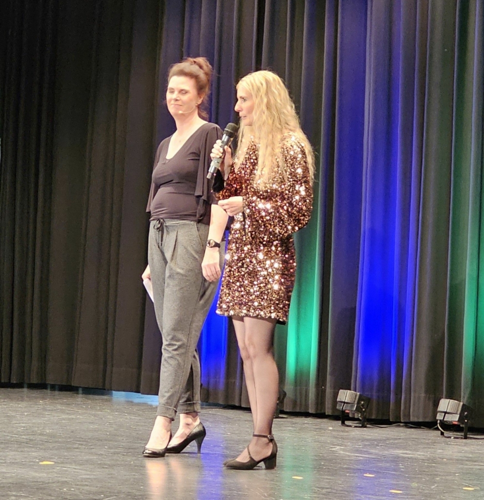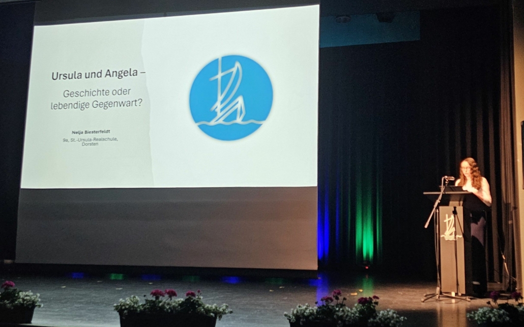 In der schuleigenen Aula begleitete dann Katrin Boers, ehemalige Ursula-Schülerin und heute als Sprecherin, Radio-Moderatorin und Podcasterin tätig, durch einen unterhaltsamen, abwechslungsreichen Galaabend. Zu Beginn ließ Nelja Biesterfeld, Schülerin der Klasse 9a, die interessierten Gäste in die bewegte Geschichte der Ursulinen eintauchen. In einem anschaulich-informativen Vortrag schlug sie den Bogen von den Anfängen des Ordens bis hin zur Gegenwart.